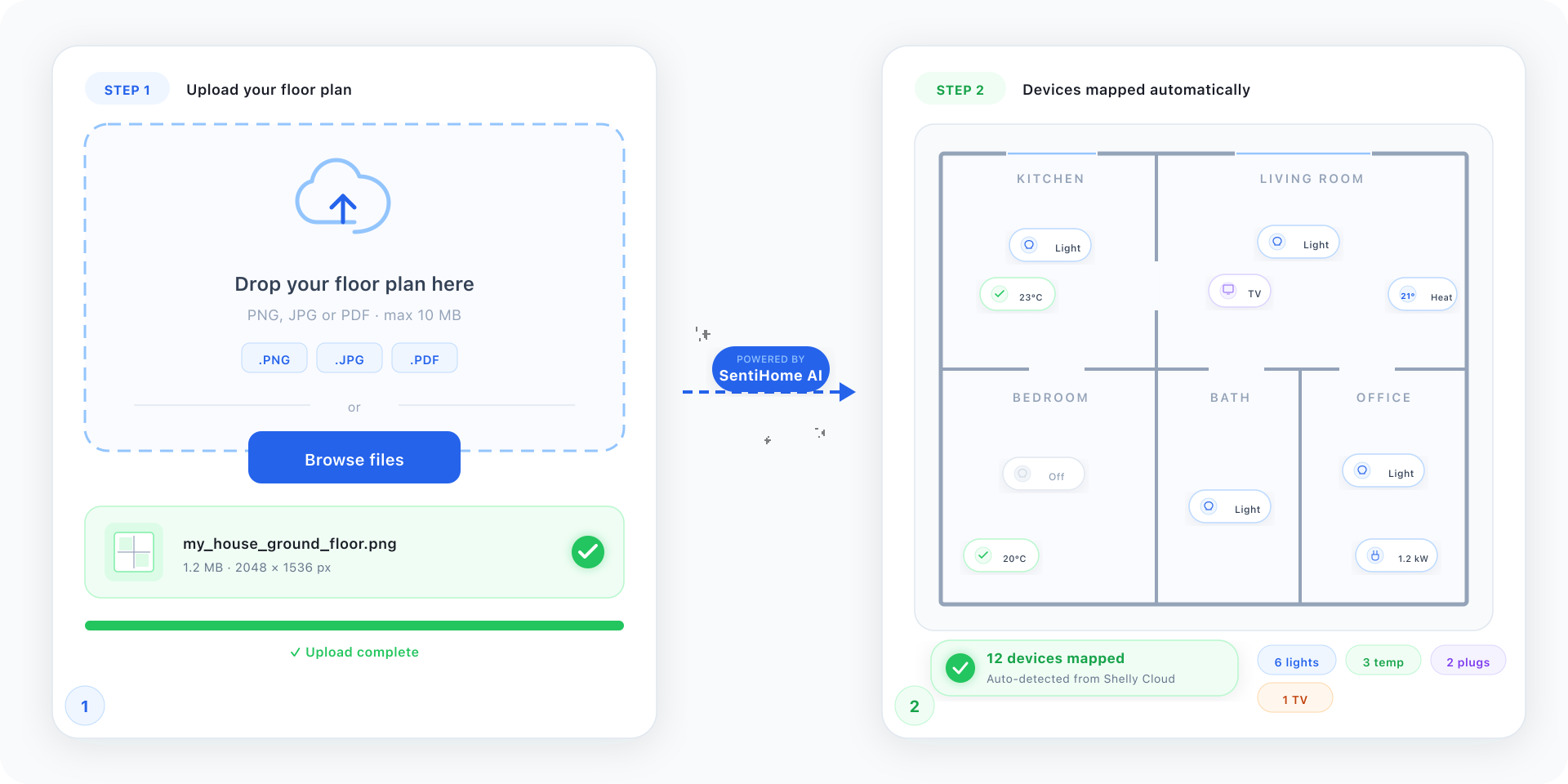 Drop in a PNG of your home. Drag devices onto the map. Done.